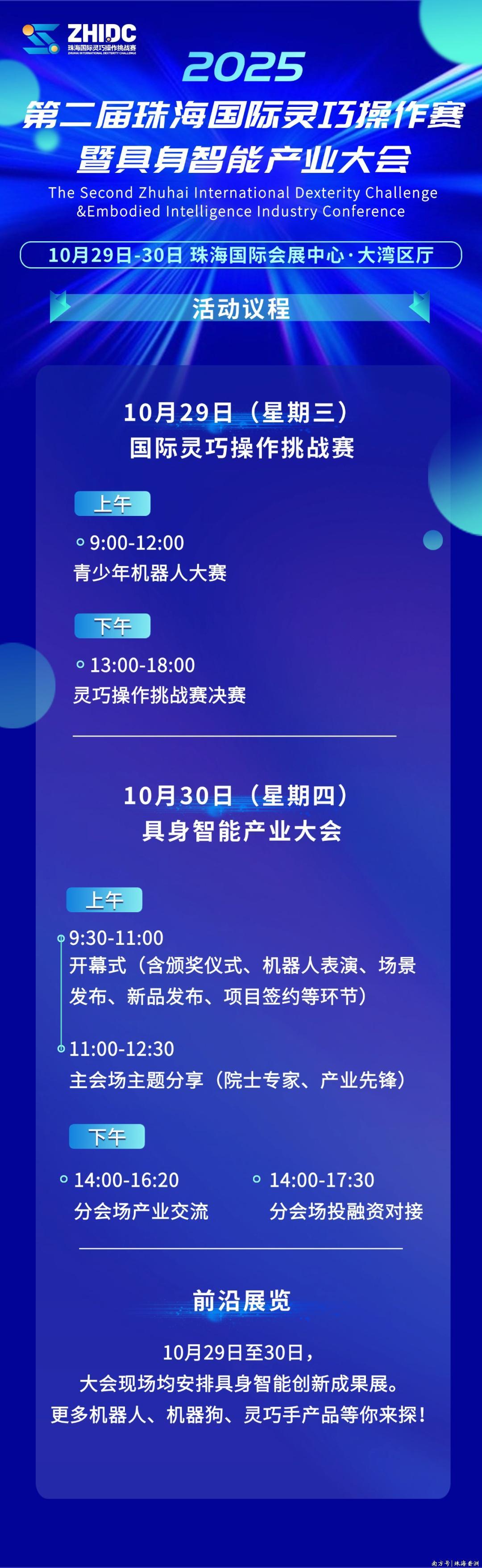 由珠海市香洲区人民政府主办的第二届珠海国际灵巧操作挑战赛暨具身智能产业大会将于10月29-30日在珠海国际会展中心举办,活动集“赛、展、会”于一体,其中大赛坚持以“用”为导向,设置生活、生产两大赛道,另设青少年机器人大赛,让青少年深入体验机器人编程、组装及竞技活动。