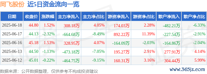 6月18日的资金流向数据方面,主力资金净流入308.18万元,占总成交额4.05%,游资资金净流入174.03万元,占总成交额2.28%,散户资金净流出482.21万元,占总成交额6.33%。